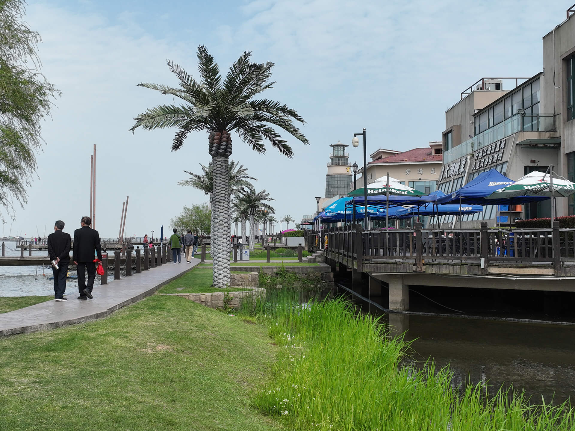 以前、漁人埠頭は太湖の漁民が集まっていて、100本以上の漁船が停泊していました。やがて埠頭が形成されました。1997年に南太湖一期開発が始まってから、多くの観光客が訪れ、食事をするようになりました。レストラン船がある程度水質(zhì)を汚染して、臺風(fēng)の季節(jié)がある安全な危険をもたらすので、2007年、湖州市政府は湖鮮街を改造することを決定して、全體のレストラン船を取り壊して、私達が今見ている漁人埠頭を新築しました。